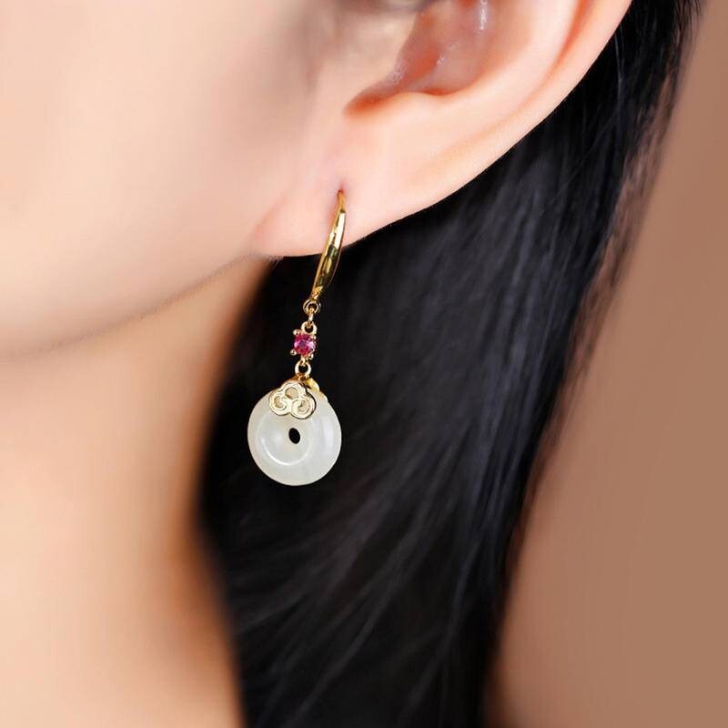 台灣現貨 平安扣耳墜 新中式耳環 耳環 耳墜 玉耳環 和田玉耳環 純銀耳還 高級感 宮廷風 耳飾 生日禮物 062 B