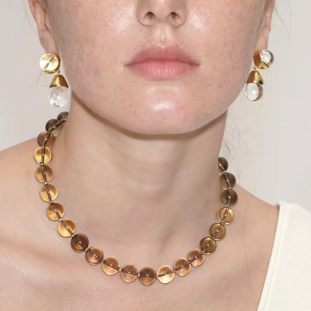 ✨ 商品尺吋:黃水晶項鍊-全長47+5CM加長鍊、串珠約7MM、 白水晶項鍊-全長約46CM、串珠1*2CM、耳釘-全長3.5VM、寬1.2CM