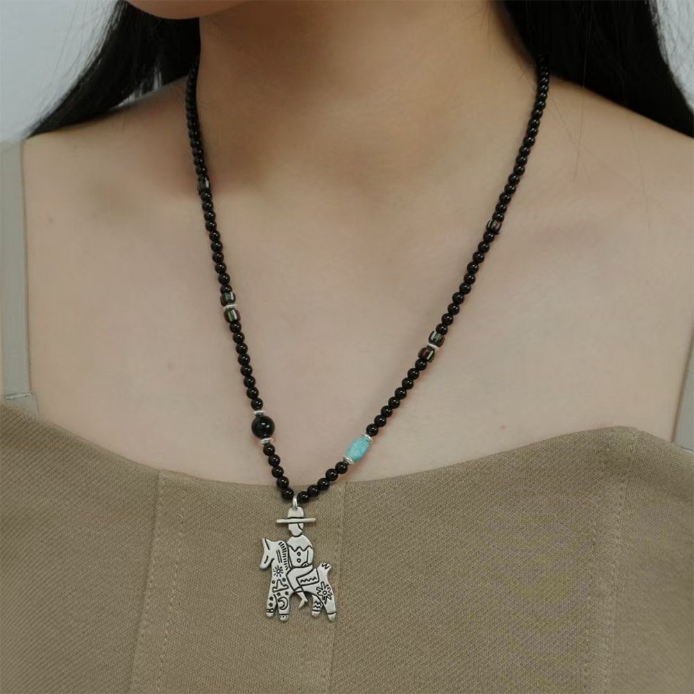 ✨ 材質:電鍍古銀+黑瑪瑙+琉璃+棉繩+綠松石+烏木
